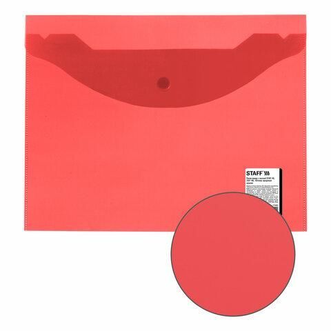Папка с кнопкой STAFF - универсальная модель для хранения, транспортировки и защиты документов и мелких предметов от воздействия негативных внешних факторов. Станет незаменимым помощником для школьников, студентов, офисных работников и творческих людей.Папка-конверт с гладкой фактурой формата А5 изготовлена из плотного матового полупрозрачного красного пластика толщиной 150 мкм. Закрывается на защелку-кнопку, что обеспечивает быстрый доступ к бумагам. Папка вмещает до 100 листов стандартной плотности.